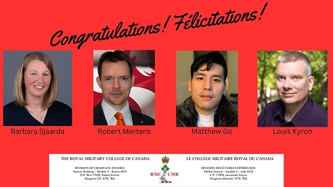 Louis Kyron habite à Whitby, Ontario. Louis étudie à temps partiel dans le programme MAA au CMR. Louis est un CPA, CGA et un membre en règle de l'Association canadienne des journalistes. Il possède plus de trois décennies d'expérience progressive et chevauchante dans les secteurs public, privé et sans but lucratif. Il est analyste principal au service des finances de la municipalité régionale de Durham depuis 22 ans. En dehors du travail, Louis consacre une grande partie de son temps à servir les autres, que ce soit en faisant don de son expertise en comptabilité à des organismes de bienfaisance locaux, en siégeant au conseil d'administration ou en étant derrière le banc d'associations de hockey pour les jeunes, ou en participant à des assemblées publiques, en donnant des conférences au collège local, en écrivant des articles publiés et des nouvelles, ou en participant à des entrevues avec les médias en tant qu'expert en matière d'industrie. Louis a choisi le programme MAA du CMR parce qu'il comprend des étudiants militaires et civils, ce qui permet de combler le fossé traditionnel. Le programme est aussi stimulant qu'il est riche, gratifiant et unique, attirant des étudiants de tous les secteurs, de tous les niveaux d'éducation, de toutes les expériences et de tous les groupes démographiques. Les professeurs comptent parmi les experts les plus recherchés pour les interviews dans les médias et sont toujours là pour les étudiants.