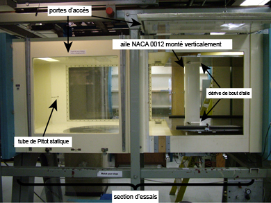 Montage de flottement / aéroélastique dans la grande soufflerie, montrant les portes d'accès, section d'essaie, tube de Pitot statique, aile NACA 0012 monté verticalement.