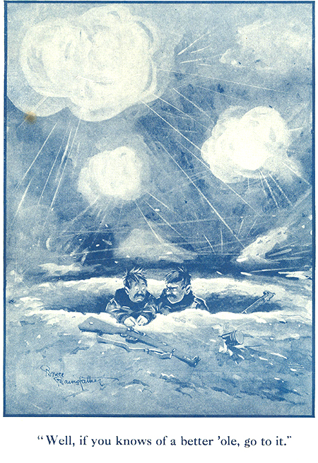 Une décennie plus tard, le Collège voyait naître son dernier, et plus improbable, hommage aux morts de la Grande Guerre. Deux bossages (saillies de type gargouille) à l'effigie des personnages de bande dessinée Old Bill et Alfie sont venus parer la porte latérale de l'édifice Yeo, la nouvelle salle à manger des élèves-officiers. Old Bill et Alfie sont deux des personnages de bande dessinée inventés pendant la guerre par le capitaine Bruce Bairnsfather, du Royal Warwickshire Regiment. Ces personnages représentaient " Monsieur Tout-le-Monde " - tous ces soldats dépenaillés mais tenaces de la ligne de front qui faisaient face à tout ce que l'ennemi, leurs sous-officiers, leur officiers et leur état-major leur assenaient. Connus et aimés de tous (sauf peut-être des officiers supérieurs, qui étaient souvent les cibles de la satire du capitaine Bairnsfather), ces personnages étaient populaires tant auprès des soldats au front que des civils au pays. Les dessins du capitaine Bairnsfather ont beaucoup contribué à maintenir le moral des troupes, et le libellé de son esquisse la plus connue, " Si tu connais un meilleur trou, vas-y donc! ", est devenu le slogan de toute une génération.