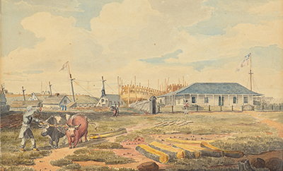Aquarelle d’origine de la maison du commodore de la Pointe Frederick, par Emeric Essex Vidal, illustrant le NSM Canada et le NSM Wolfe en construction (aucune des deux constructions n’a été terminée). Numéro d’accession 20110096-001