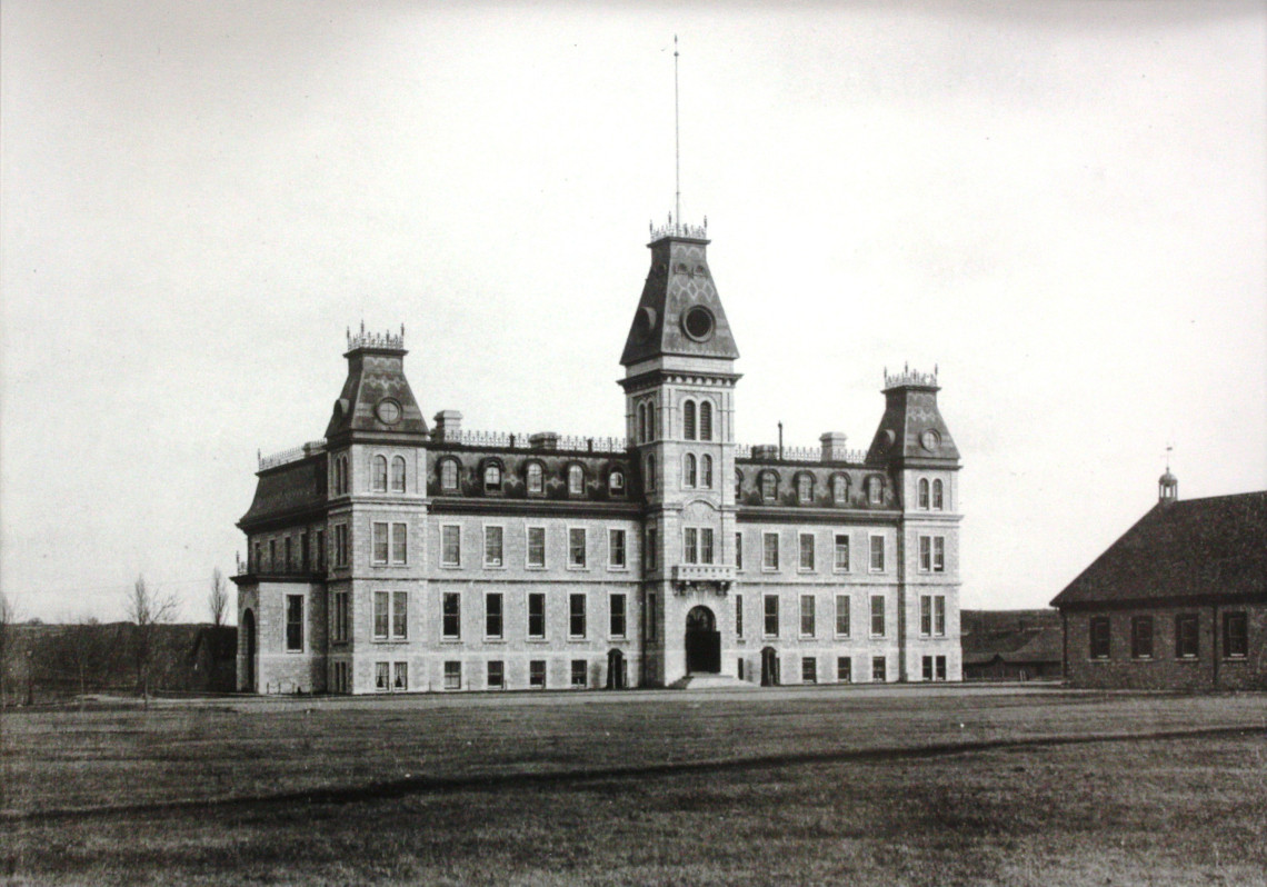 Le ministère des Travaux publics, sous la supervision de l’architecte en chef Thomas Scott, entama la construction du pavillon d’enseignement en 1877. Les dessins et les travaux furent supervisés par l’architecte de Kingston Robert Gage, qui était féru du style Second Empire.
