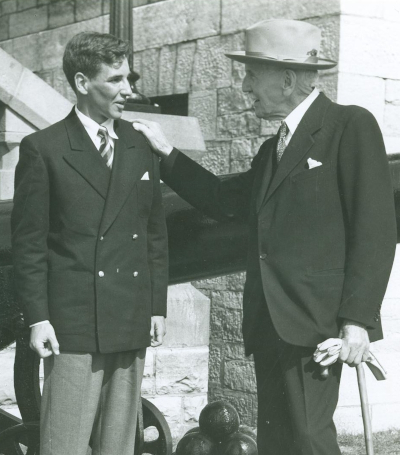 Les membres du Club des anciens élèves-officiers, notamment A.B. Perry (RMC 1876-1880),  étaient de fervents partisans de la réouverture du CMR. Ici, A.B. Perry rencontre  W.D. Hargraft (RMC 1948-1952),  à la réouverture du Collège en 1948.