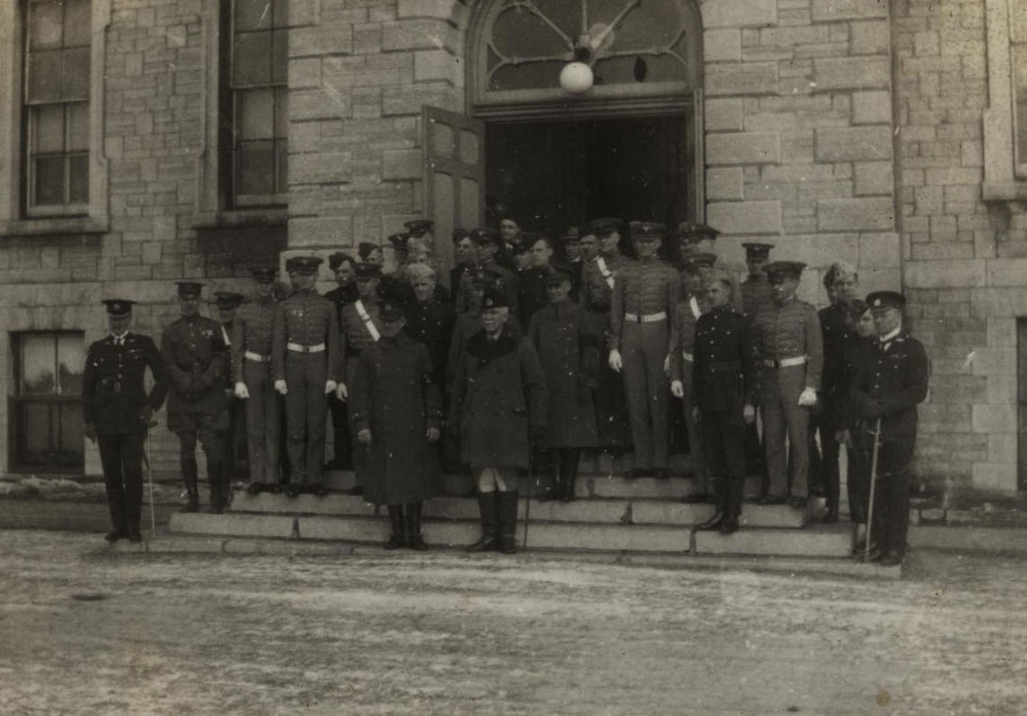 Des cadets et des officiers de la United States Military Academy (académie militaire des États-Unis) et du CMR à l’extérieur de l’édifice Mackenzie, 1924