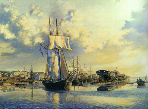 Toile : Coucher de soleil à Sackets Harbor montrant la goélette américaine Hamilton sortant du port et, dans l'arrière plan, le navire de guerre General Pike en construction. Toile reproduite avec la permission de l'artiste, Peter Rindlisbacher.