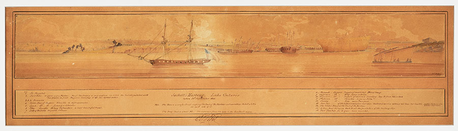 Un dessin contemporain de Sackets Harbor en septembre 1815 par le lieutenant E.T. Vidal, RN; on y voit l'hôpital, le Fort Pike, les casernes, 10 navires dont l'un est en construction, et le Fort Tomkin.