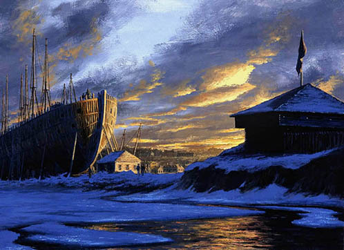 Toile : L'hiver à Sackets Harbor illustrant la réponse américaine au lancement du HMS St. Lawrence, un navire de ligne, soit la construction de deux navires encore plus grands, dont l'un est illustré ici. Toile reproduite avec la permission de l'artiste, Peter Rindlisbacher.